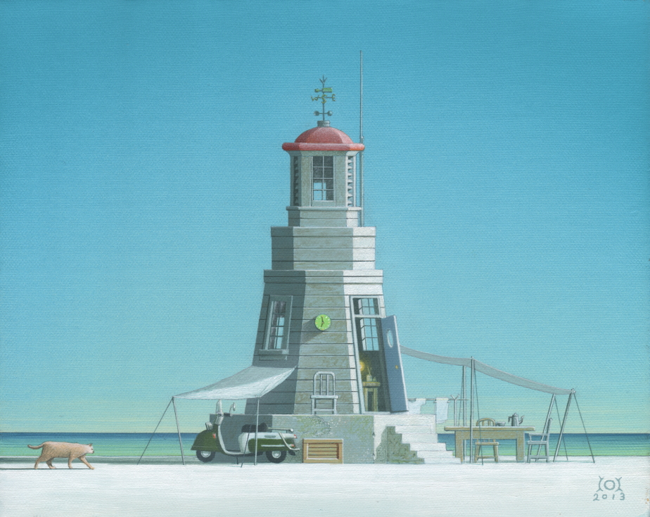 この絵は何年か前に水彩で描いたもののリメイクです。 猫など新たな要素も加わりました。 鉛筆での下描きが残っていたのですが、 水彩で描いた作品の写真は無いので、 見比べるとずいぶん違うものなのではないかと思われます。 明るい朝の空気など感じていただければ幸いです。