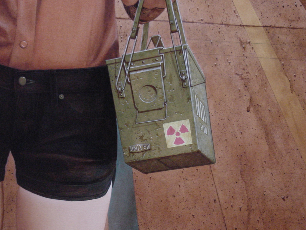 左手及び右足が機械。下げている箱には三つ葉マーク。