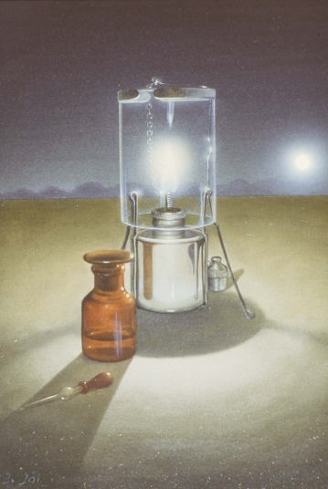 このランプは一見理科の実験器具みたいに見えますが、 単なるアウトドア用のランプです。 このような絵を描くときは、バックにくろい膜を張って、 モデルを組んで、一方から光を当て、 キャンバスの付近だけを照らすようにもう一つの灯りを用意します。 外は晴れていても、暗い部屋にこもっての陰気な仕事になります。