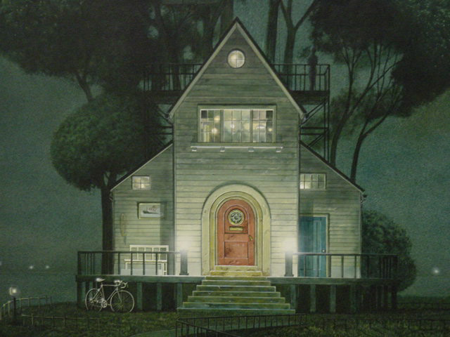 湖畔にたたずむ小さな家。後ろの樹木と一体化しているよう・・