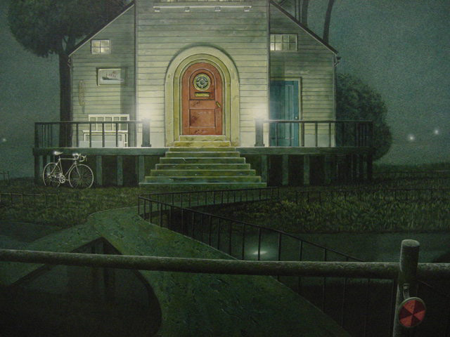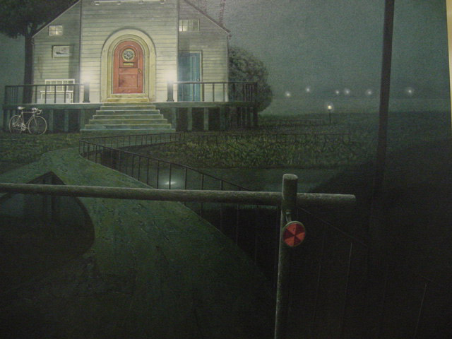 自転車、ベンチ、赤いドア。 ベンチの上に掛けてある絵は四本煙突の貨客船。