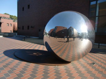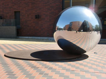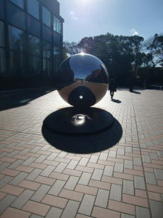 さらに影をご覧下さい。後ろの鉄板をすっぽり被っています。 これは12月16日に撮った写真なので、 おそらく春分と秋分には影と鉄板の大きさが ぴったり一致するのではないでしょうか。 恐るべし、都美館の銀玉!! |