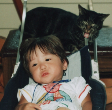 ねこ(ニャモジという名前でした)が欠伸をした後で、息子が欠伸をしているのが分かります。