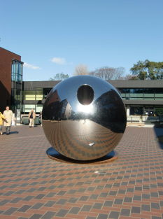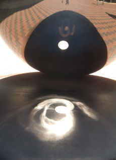 左の写真、東京都美術館の入り口近くにあるオブジェです。 前から見ると縦長で円形の穴が開いていて 後ろまで続いています。 ここを訪れた人は一様に面白そうに覗いたり していますが、この穴の真の意味が分かりました。 先日お昼に訪れたときのことです。 後ろにできる影の中央に太陽の光が突き抜けて いるではありませんか。 |