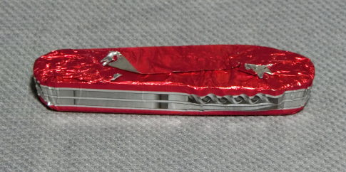 実によくできていますが、 これ、チョコレートです。 横から見ると端の方に 銀紙のしわが見えますよね。 側面に見えている缶切りや、 栓抜きや、コークスクリュウは 銀紙表面の印刷です。 チョコレートにも多少の でこぼこをつくってありますが、 見事なだまし絵になって いますねー あまりのクオリティーの 高さにびっくり!! |